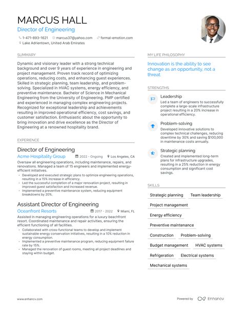 Director Engineering Resume. Strong affinity to business processes and demonstrable impact to a company’s performance with software. Coordinating renovation and capital projects within the framework and time limits established.
